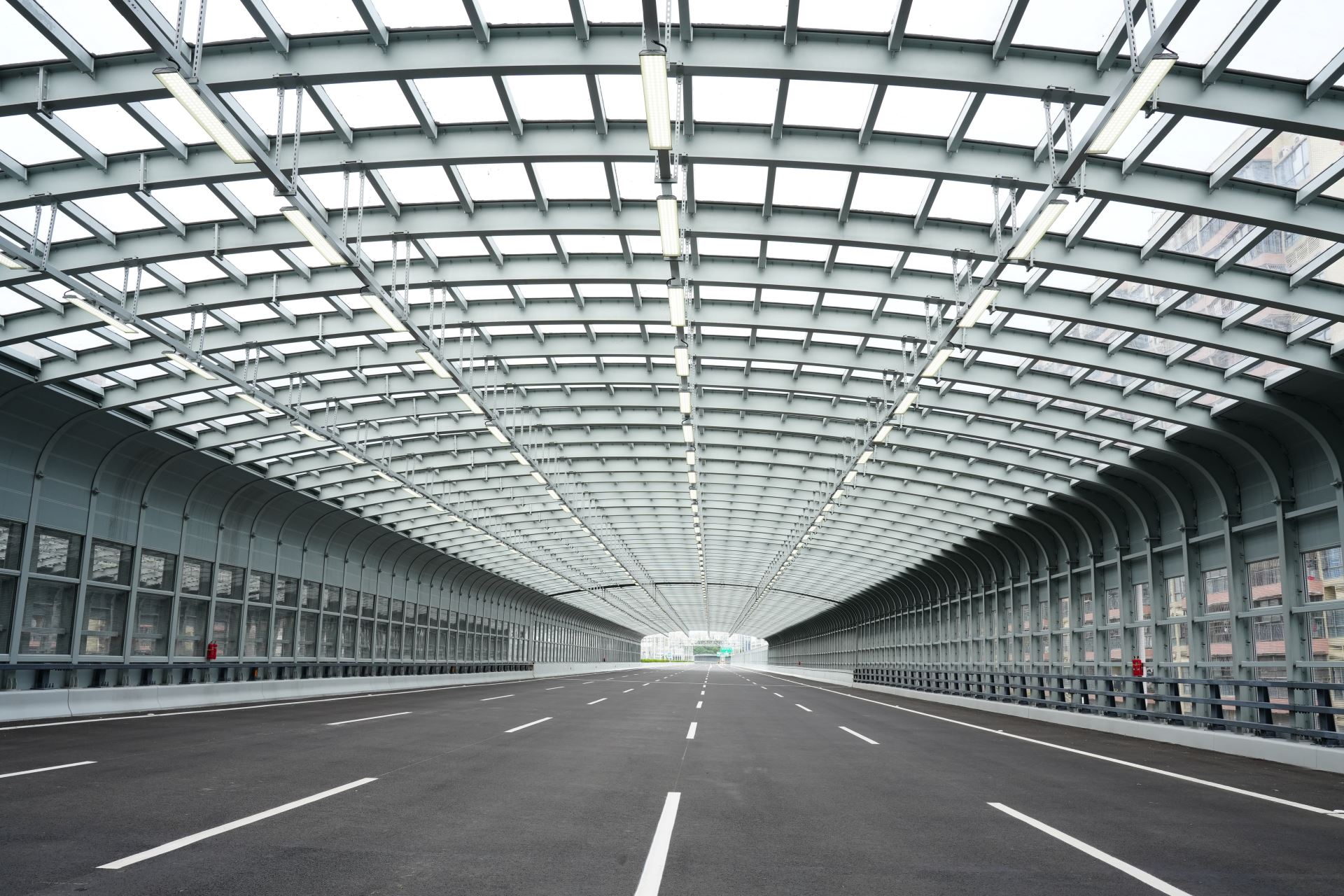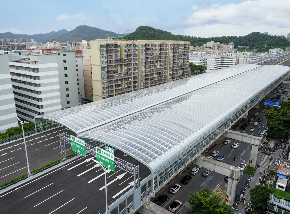 该项目位于深圳宝安区,是国内目前高速公路声屏障单体招标最大工程项目。声屏障全线长6033米,覆盖面积约为9.5万平方米。项目全线声屏障隔音板采用透明设计,顶部采用弧形弯梁结构设计,涵盖全封闭、半封闭和直立式声屏障等近10种结构,其中全封闭单幅最大跨度达37m,为高速公路全封闭单幅跨度之最。
