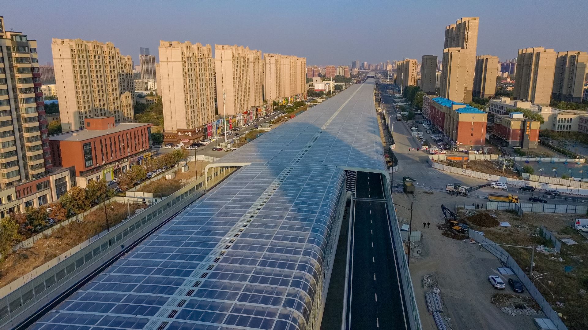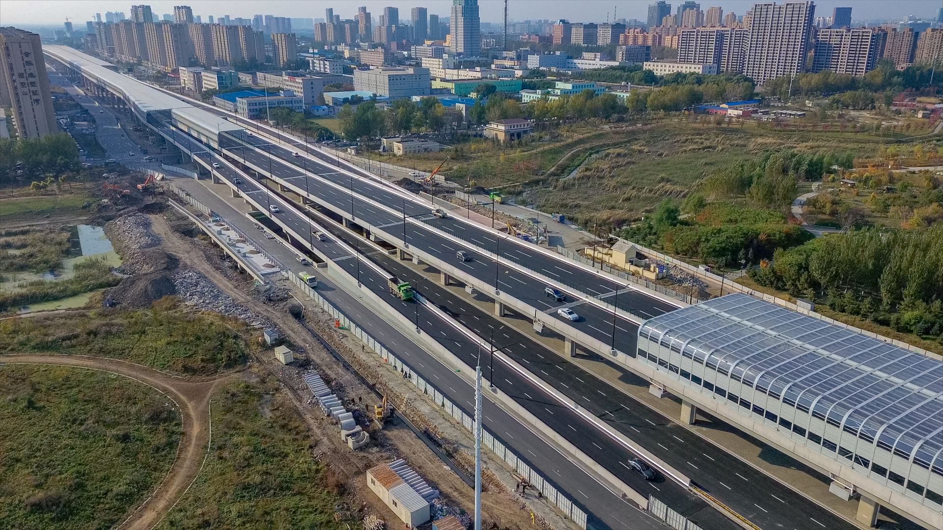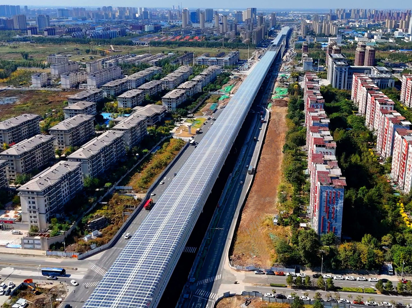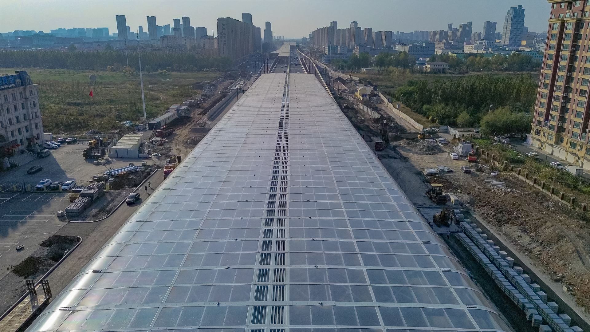 项目总面积逾10.6万㎡,总长度3.72km,包含直立式声屏障1.03km,半封闭声屏障 0.53km,全封闭式声屏障 2.16km。其中全封闭声屏障最大跨度 46.8m,是目前北方地区最宽声屏障工程。